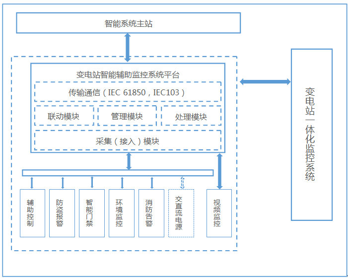 變電站智能輔助系統主要由輔助監控主機、站端綜合管理單元、站端工作站、交換機、智能門禁、視頻監控、防盜報警、消防報警、環境監測、燈光控制等子系統以及信息傳輸通道等設備及管理平臺組成。