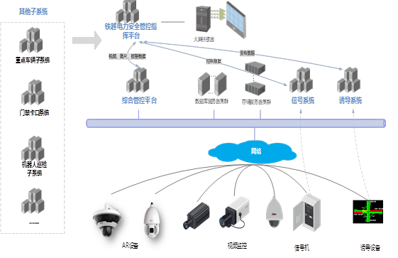 安全管控系統面向指揮平臺,智能綜合管控平臺接入外場各基礎設施資源,如前端AR守望者、AR高空球、視頻監控等,信號系統負責接入所有信號控制設備,誘導系統負責接入所有外場信息誘導設備,同時可以與已建業務系統打通,平臺通過數字標簽方式,將各系統進行標簽結構化,打通與各系統之間數據交互,通過指揮中心大屏以“畫中畫”展示各系統內容,實現平臺對接入的子系統進行資源統一調度。