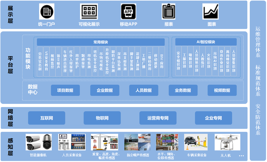 感知層:采集前端各類(lèi)感知設(shè)備的數(shù)據(jù)信息。感知設(shè)備包括AI智能攝像機(jī)、人員采集設(shè)備、重量/高度/角度/幅度傳感器、揚(yáng)塵噪聲傳感器、水平/傾角/位移傳感器、車(chē)輛采集設(shè)備、無(wú)人機(jī)等。